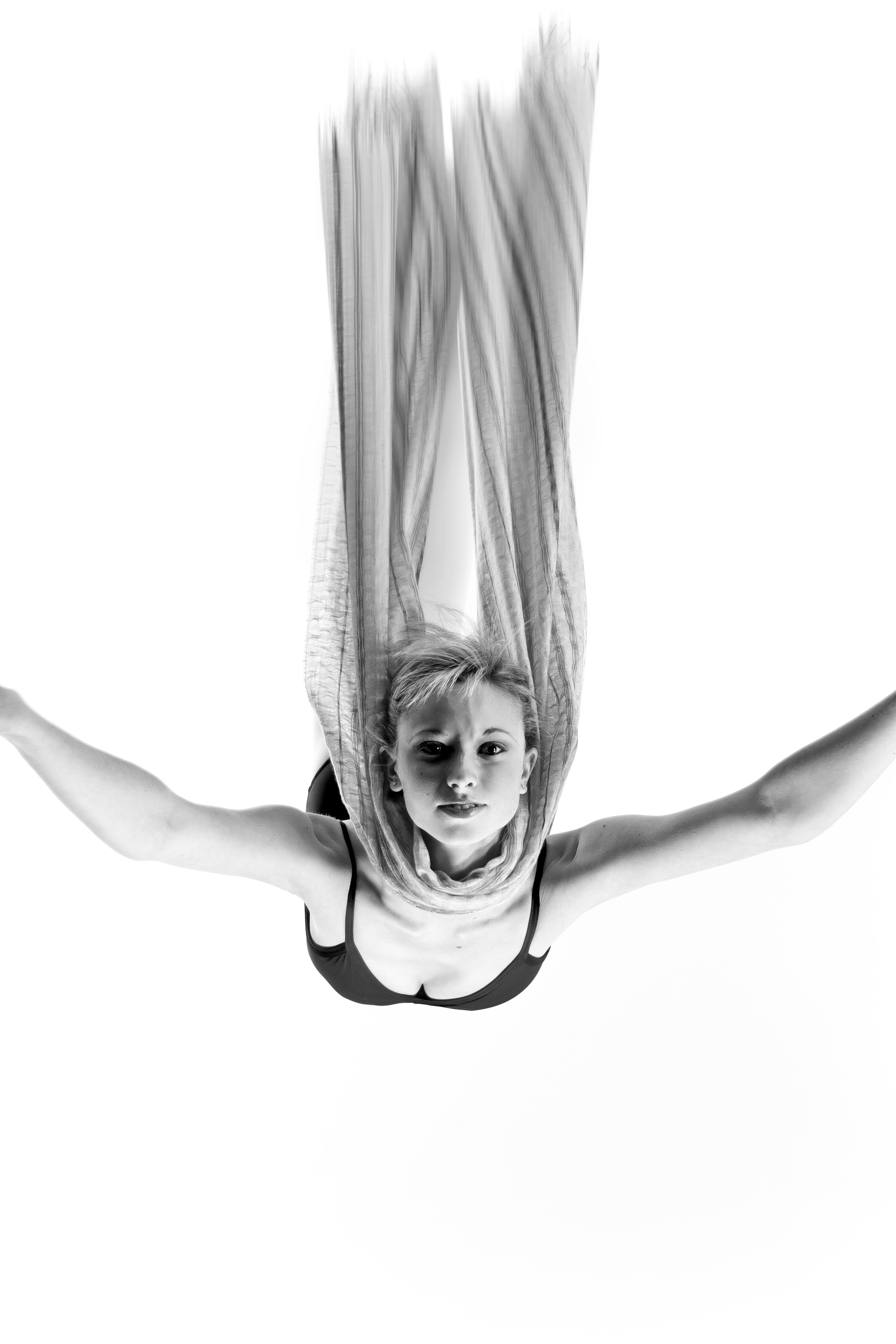 The angel is actually standing and doing a backbend. I rotated her 180ยบ and added a motion blur in Photoshop.