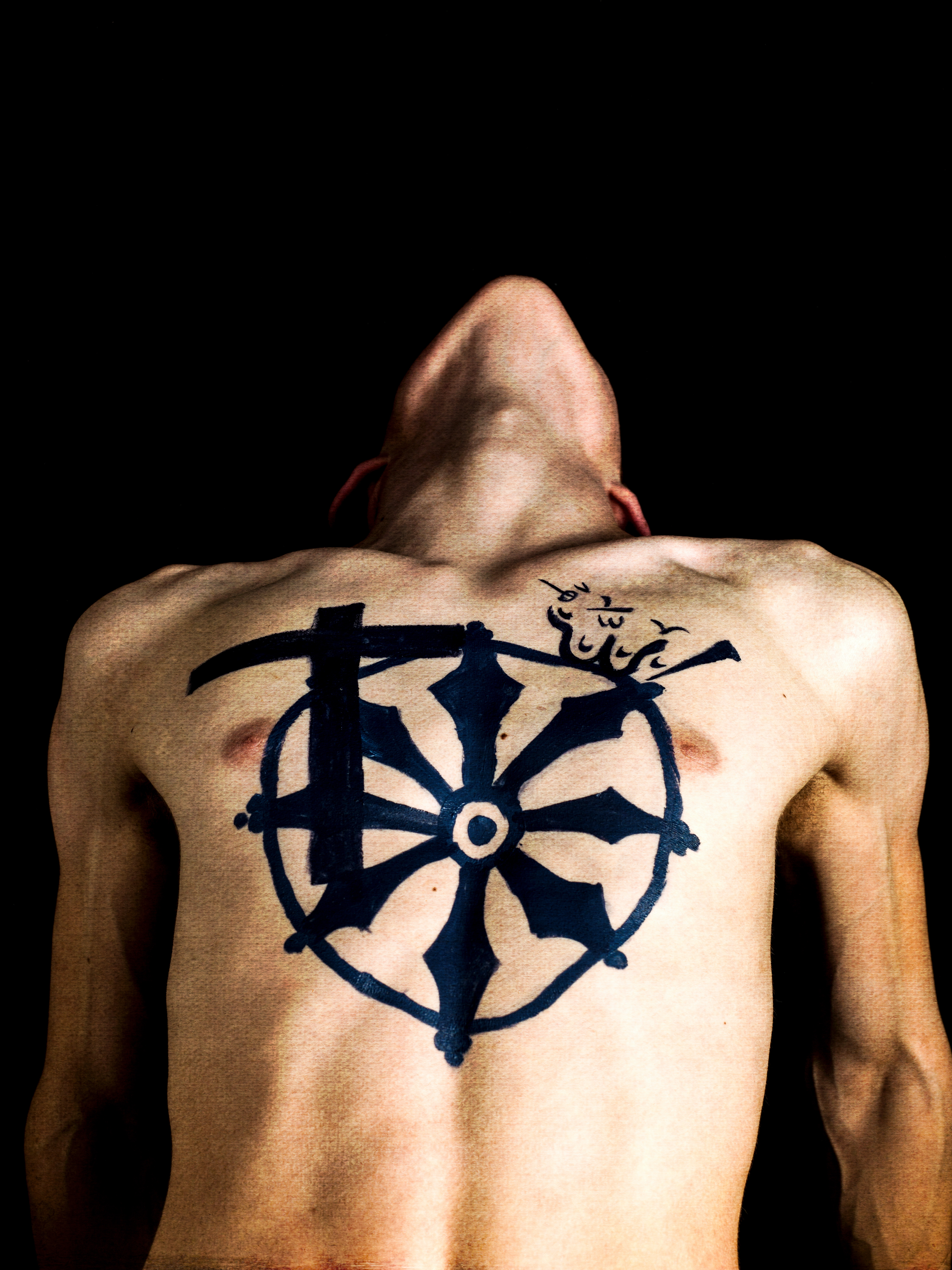 The Wheel of Life is painted on the straining body of a man crucified.